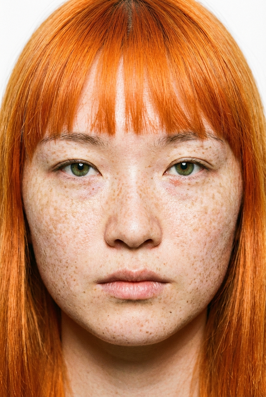 GLITCH_MARK: Uncanny combination of vivid green irises, dense freckling, and Asian facial structure