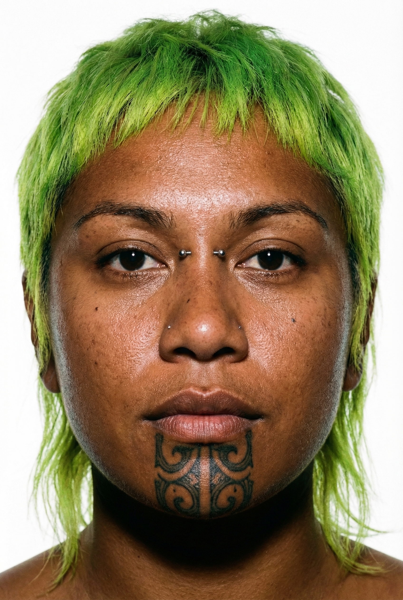 GLITCH_MARK: Symmetrical traditional black ink chin tattoo combined with bridge piercing